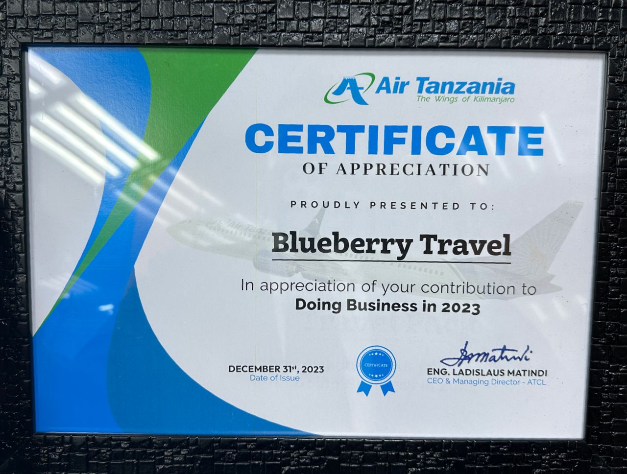 » AIR TANZANIA CERTIFICATE OF APPRECIATION DOING BUSINESS IN 2023 TANZANIA